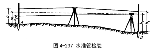检验:在地面选定A、B两点,相距60~100m,置仪器于A、B之中点,对两端所立标尺进行观测的读数a1、b1(图4-237),a1-b1=h即为两点间的正确高差。然后将仪器搬近B点,紧靠B整置仪器,使望远镜目镜端靠近标尺,自物镜端观测水准尺,以铅笔尖指出圆孔中心在尺上的位置,在镜外读得B点标尺之读数b2(即仪器高)。然后再对A点所立水准尺进行观测得读数a2。若a2-b2=a1-b1,则此项条件满足。