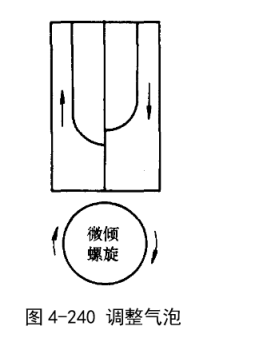 (1)安平 安平方法与普通水准仪大致相同。不过此仪器长水准灵敏度极高,气泡动荡静止较慢,应注意将脚架安踏牢固,安平时先使圆水准大致居中,为了尽量提高视线,减少地面折光影响,仪器架应尽量架高。在瞄准水准尺之后用微倾螺旋作精确居中,此时只需稍微转动一下即可。螺旋转动的方向与气泡像相对移动方向是一致的(图4-240)。