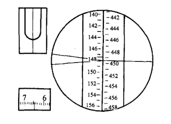 如图4-241所示,左尺(或称主尺)读数为148cm,测微读数为0.647cm,此读数为主尺148.647cm。然而进行右尺(或称为副尺)读数,每一相同高度主副尺读数总是相差301.550cm,由此可以核对读数。