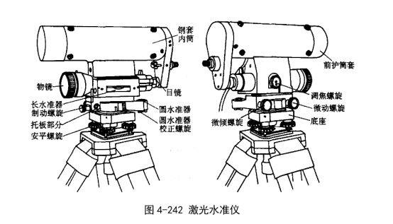 图4-242是我国烟台光学仪器厂生产的YJs3激光水准仪的外形。其构造是在S3水准仪的望远镜上加装一只He-Ne气体激光器,原理与J2-JD激光经纬仪相同。