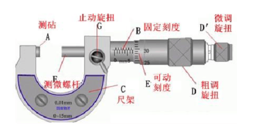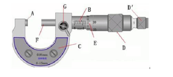 2)左手持尺架(C),右手转动粗调旋钮D使测杆F与测砧A间距稍大于被测物,放入被测物,转动保护旋钮D′到夹住被测物,直到棘轮发出声音为止,拨动固定旋钮G使测杆固定后读数。