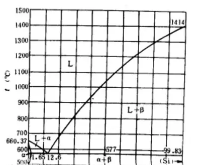 铝硅二元合金具有简单的共晶型相图,如图《Al+Si二元相图》所示,室温下只有α(Al)和p(Si)两种相,α(Al)的性能和纯铝相似,β(Si)的性能和纯硅相似。共晶合金的Si含量为12.6%,亚共晶合金的组织由α(Al)+共晶体(α+p)所组成,过共晶合金的组织由β(Si)+共晶体(α+β)所组成。由于结晶硅带入微量磷,即使10ppm的磷生成AlP就足以使Si含量为9%的亚共晶合金中出现初晶硅,并使共晶硅形成粗大的板片状。