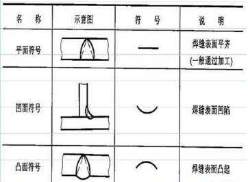2、焊接辅助符号,如下图所示,是表示焊接表明形状的符号,如凸起或凹下。