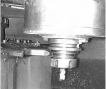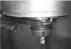 (5)将铣刀柄装入主轴锥孔,Z 轴移动至换到平面,机械坐标显示值为 Z-104.6,手动将刀库缓慢靠近主轴,发现换刀点偏高(如图 2 所示),即换刀点位置发生了变化。换刀点位置与机床零点有关,此值在参数中设置,一经设置,在不重新设置的情况下便不会再改变。由于机床每次开机需进行回零的操作,当机床零点位置由于种种原因发生改变时,当前的换刀点便会和原设好的换刀点有误差。对于不需回零的机床刀库而言,即使机床的零点位置发生改变,也不会影响换刀点的位置,只是当机床的 MOS 电池不起作用、数据丢失的情况下才需要调整零点的位置,进而重新调整换刀点的位置。这台机床每次开机后需进行回零操作,所以问题显然是机床零点位置的变化导致换刀点位置发生了改变。