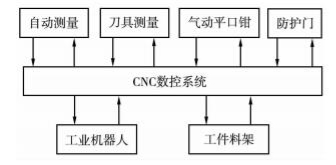 控制系统框图如图 2 所示,CNC 数控装置作为智能制造单元的控制核心,所有控制指令由 CNC 控制系统发出,工业机器人协助完成工件的上、下料及搬运工作。自动测量装置分为两部分,测头和接收器,测头安装在刀柄上,由数控程序控制实现自动测量,接收器安装在机床本体上,接收来自测头的信号。气动平口钳完成工件的夹紧和松开,防护门由气缸驱动起安全防护作用。工件料架存放待加工毛坯和加工好的成品。