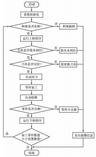 数控程序实现对整个加工过程的控制,按下循环启动按钮(或远程启动按钮),主程序运行,对系统进行初始化。机床各轴运行到指定位置,平口钳松开,防护门打开。同时判断料架是否有料,没有料发出缺料信号,如果有料,数控机床发出上料指令,机器人将毛坯从料架搬运到数控机床平口钳位置,平口钳夹紧上料完成。数控机床自动对刀,运行加工程序,加工完成运行测量程序,判断零件是否合格,如果不合格,发出不合格报警,合格则运行下料程序,判断加工零件数是否达到设置值,少于设置值,继续运行上料程序,加工下一个零件。如果零件加工数量达到设置值,程序结束,实现零件自动加工。工作流程如图 3 所示。
