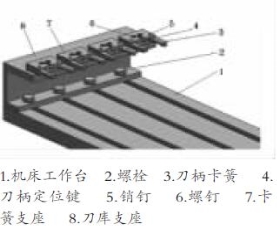 如图1 所示,刀库应该固定于工作台的左侧,将占用工作台X 轴的一部分。为了使整个编程明了、简单,应该将所采用的刀具以及刀库刀位进行一一对应,1 号刀一定要装在1 号刀库上面,2 号刀要装在2 号刀库上面, 以此类推,要严格自信地装刀,一旦装错将会引起刀具之间的干涉。