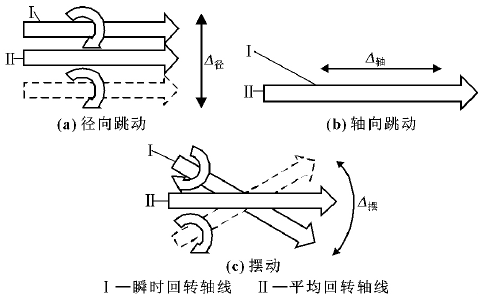 主轴动态误差就是主轴在一定转速工作下的回转误差,机床主轴回转是机床最基本的成型运动,是决定工件圆度的主要因素之一。主轴回转精度可以定义为: 主轴回转线在回转时相对于其平均周线的变动量在误差敏感方向的最大位移[8]。它可以是径向跳动、轴向跳动或摆动,如图 1 所示。一般情况下 3 种误差同时存在,并相互叠加,影响主轴精度。