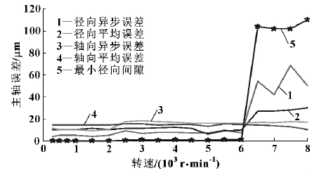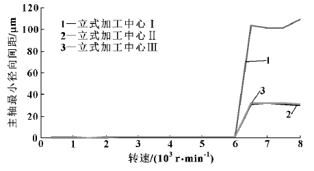 将测试方案中不同转速下,对 3 台立式加工中心的径向异步误差、径向平均误差和最小径向间隙进行统计,3次测量结果取平均值,其结果如图 4—6 所示。