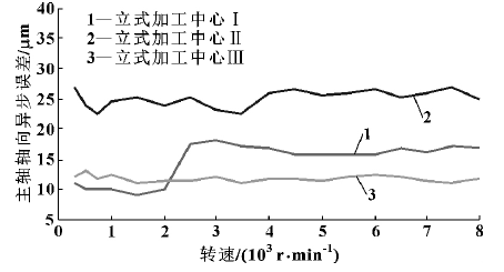 3 台立式加工中心的径向误差存在较大差异,不仅表现在个别转速下的误差区别,而且在总体变化趋势上也有不同之处。如转速为 6 000 r/min 之后,立式加工中心Ⅰ的径向误差有了较大的升高,而另外 2 台立式加工中心的径向异步误差提升并不明显。这说明,同一型号的机床由于安装、工况等因素的不同,径向精度会有较大区别,变化规律也不一样。良好的安装、工况可以提升主轴的径向精度,进而可以提高加工精度。