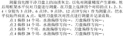 1.2.4 依据刀盘倾斜量和倾斜方向对刀座进行校正通过上面记录的最大数值28司分析, 可知刀盘已经发生倾斜同时也可判断出刀盘的倾斜方向, 因此需要对刀盘进行调整以消除最大倾斜值。方法是拧松刀体齿轮箱部分的螺栓, 在其倾斜的反方向下部塞进铜质调整垫片, 垫片的厚度为最大数值的一半。即28/2=14司。塞进垫片后拧紧螺栓再重新按照上述方法用水平仪进行测量调整直到满足所选四个方向偏移量保证在10个司内即可。此时端铣床刀座部分调整完毕。