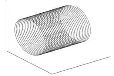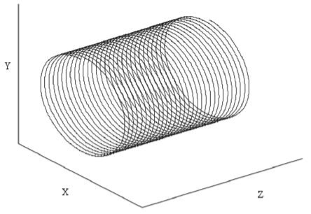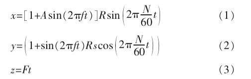上述公式中, x、 y、 z 是相应刀具尖端的坐标, R 为走刀等效半径, N 为同坐主轴的轴稳态转速, A 为等效的振动幅值, f 为等效的震动频率, F 为实际进给量, t 为刀具工作时间。 根据刀具尖端的运动公式 (1)、 (2)、 (3), 外圆加工过程中, 相应的机床刀具 (车刀) 工作尖端运动轨迹如图 2 所示。 在相应的径向上的运动路径为如图 3 所示的圆, 在轴上的刀具尖端相对水平如图 4 所示。 这样综合各个方向的变化状态构成了工件外圆经车削加工后相应的理想表面粗糙度。
