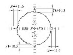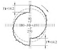 (1)反向间隙对圆度误差的影响 反向间隙的存在会影响机床的定位精度和重复定位精度,降低数控机床加工精度,在加工中心铣圆过程中会造成圆度误差。当Y轴在反向运动过程中,由于反向间隙的存在,会造成Y轴反向后滞后于X轴进行插补运动,铣圆加工会出现如图1所示结果。