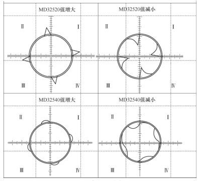 (2)反向跃冲的调整方法 反向跃冲存在的主因是摩擦力状态的改变,所以在出现反向跃冲时,应当给插补轴加上摩擦补偿,在西门子数控系统中,摩擦补偿是由摩擦补偿值MD32520和摩擦补偿时间常数MD32540决定的。对于反向跃冲的调整,首先设置MD32500=1(摩擦补偿有效),再调整跃冲轴对应的摩擦补偿值MD32520和摩擦补偿时间常数MD32540,两个参数值的大小调整对象限点影响可参考图7进行,直到过象限尖点被消除。需要注意的是设置的补偿值不宜过大,当MD32520>150mm/