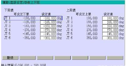 软限位是软件中设定的各轴运动范围限值。了解机器人的运动学原理,就会知道,关节机器人之所以能在空间里准确到达一个位置,依靠的是各个轴分别从零点开始开始旋转特定的角度,从而合成出最终的位置。注意,“零点”这个关键词,意即每个关节开始运动的参考点,即0度。既然机器人可以自己计算每个轴从零点开始转了多少角度,那么自然就可以有一个新的参数:软限位(相对应于硬限位)。可以设定正方向 P 度,负方向 N 度是轴的活动范围,这样,当机器人运动过程中一旦检测到超出这个范围,控制器就让机器人停下来,然后弹出相应错误信息提示超限位了。软限位应该小于机械限位的,这样,当软限位失效后,硬限位就可以继续起作用。机器人运动到该限值时警告,机器手下电,警告可以取消。每个轴都有软限位(下图是各轴运动的软限位)。