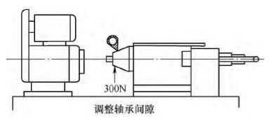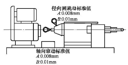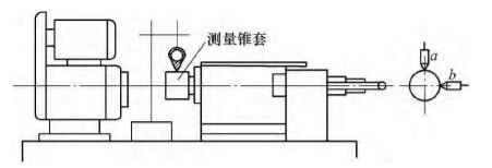 (5)检查主铀与工作台的平行度(见图5)。要保证砂轮主轴中心线对工作台移动的平行度,在100mm测量上允差应在0.015mm以内,测量套自由端只许上翘,如果超差,可取出上端前后两块轴瓦,进行调整。检查轴瓦的接触面要在60%--70%,如果不在正常范围之内,可修刮轴瓦,研点时要将蓝油涂于标准棒,然后把轴瓦放上,以双手拇指按平轴瓦,左右研动^刮削要求每(25x25)mm2内I8-2〇点为宜,若超过25点,不但轴瓦容易磨损,而且油膜形成困难。通过调整后端两块下轴瓦来纠正主轴与工作台的平行度。在沒有原始母件的情况下(测量套),可以用大量程千分表或百分表测量,测量时可以同时在主轴上打上两块千分表测量上母线和测母线(砂轮主轴中心线对工作台移动的平行度a、6在100mm测量长度上均为a:0.015mm,6:0.020mm)n把床身一侧的防护罩拆下,在平面导轨上放一把深度尺测量工作台移动的距离^测量方法:把测量的千分表调整好后,记录表的原始数据8imn,然后移动工作台(表头不能出主轴的锥面),记录测量的长度81.75mm,测量长度81.75minx主轴锥度的比值0.05加上原始数值8mm就等于理想值12.0875mm,实测值为11.998imn,理想值-实测值就等于误差a,值为0.0895mm,通过测量计算6为0.045mm。通过调整下端后轴瓦恢复精度。安装上端两块轴瓦,调整主轴轴承间隙(见图6>D在0.012 ̄0.〇25mm之间^间隙调整好之后,在未安装砂轮之前,应空运转2h,每15miri检测一次温度,轴瓦温度与主轴箱油温应上升均匀,若不超过原温度20T;,则说明调整间隙合适。在这同时,可以检测主轴的轴向窜动和径向圆跳动(见图7)。