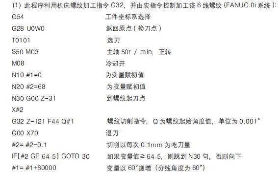 首先,分析该工件螺纹为 6 线矩形螺纹,螺纹的起始点在工件的中间部位,如果采用轴向分线法, 两端的退刀槽都没有足够的刀具移动空间,轴向移动螺纹起点必然造成刀尖与工件干涉。因此,选用 圆周角度分线法,该螺纹为 6 条螺旋线,分线角度为 360°/ 6=60°。选用与螺旋槽相同宽度且带有螺 旋升角的矩形螺纹刀,以减少刀具与工件的切削抗力。 螺旋升角的计算公式为 :tanφ=nP / πd2,其中 φ 为螺纹升角,nP 为螺纹导程 (n 为螺纹线数,P 为螺距 ),d2 为中径。 (1)此程序利用机床螺纹加工指令 G32,并由宏指令控制加工该 6 线螺纹 (FANUC 0i 系统 ):
