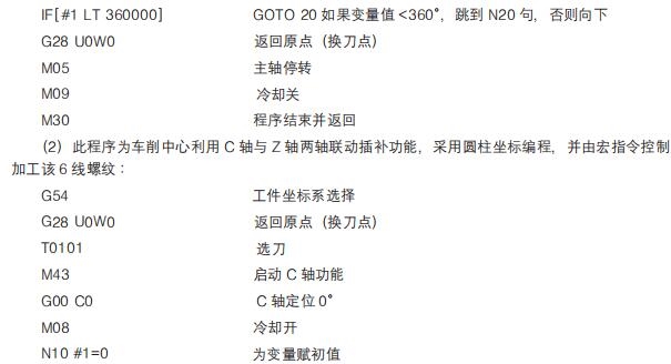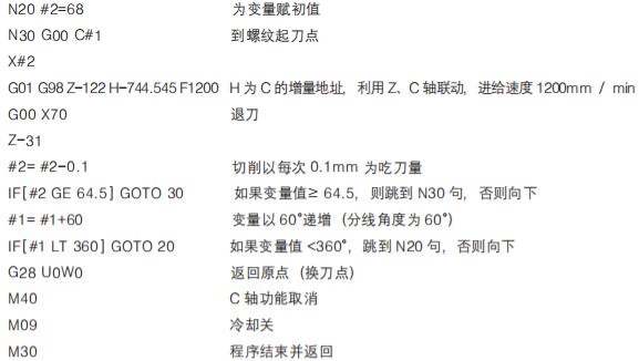 其中 C 轴所转角度计算如下 :H=( 螺纹起始点与终止点的距离/螺纹导程 )×360°。 该程序走刀速度可由机床倍率开关控制,方便在加工过程中的调整,也能二次装夹修复螺纹,因 此非常实用。