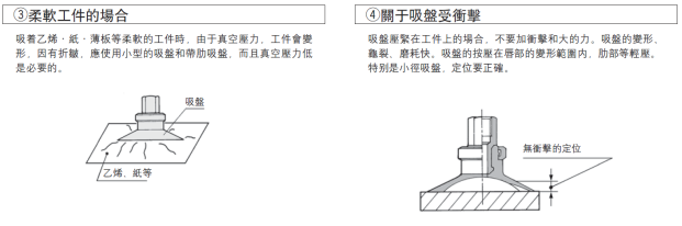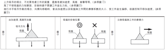 2.4)真空吸盘的剪切力(吸着面和平行方向的力)与力矩都不强,应用时,考虑工件的重心位置,使吸盘受到的力矩最小;