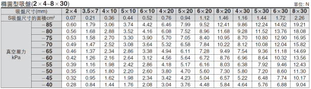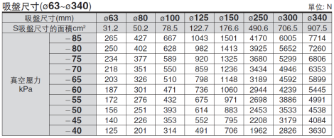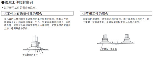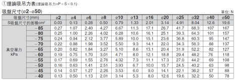 2.9)理论吸吊力:使用真空发生器的场合,真空压力大约为-60KPa;真空压力应设定在吸着稳定后的压力以下;但工件有透气性、工件表面粗糙容易吸入空气的场合,需根据实际测试来确定真空压力;