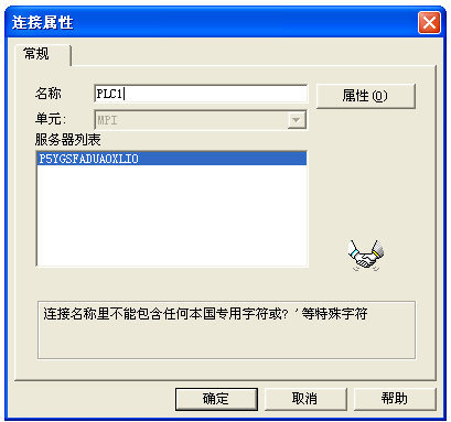 6 随后出现的“连接属性”对话框中,名字输入PLC1,确定。