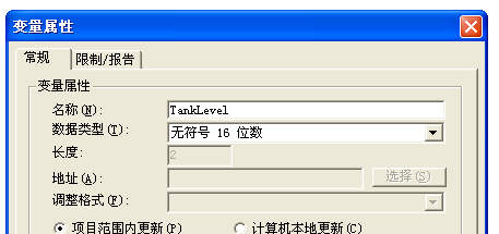2 变量属性对话框:变量名改为TankLevel,数据类型:无符号的16位数。