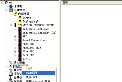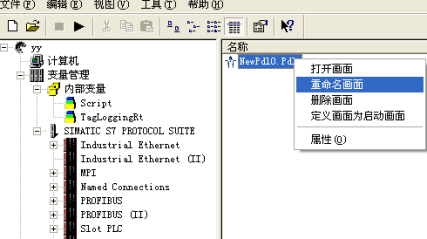 在浏览窗口,右击“图形编辑器”->新建画面,接着, “NewPdl0.pdl”出现在数据窗口。