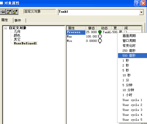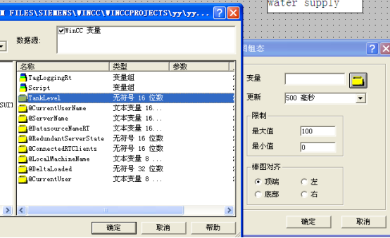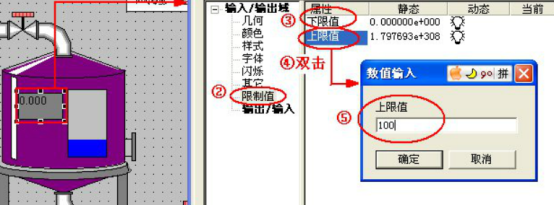 将变量连接到TankLevel,更新周期改为500毫秒,将限制最大和最小值修改为100和0。